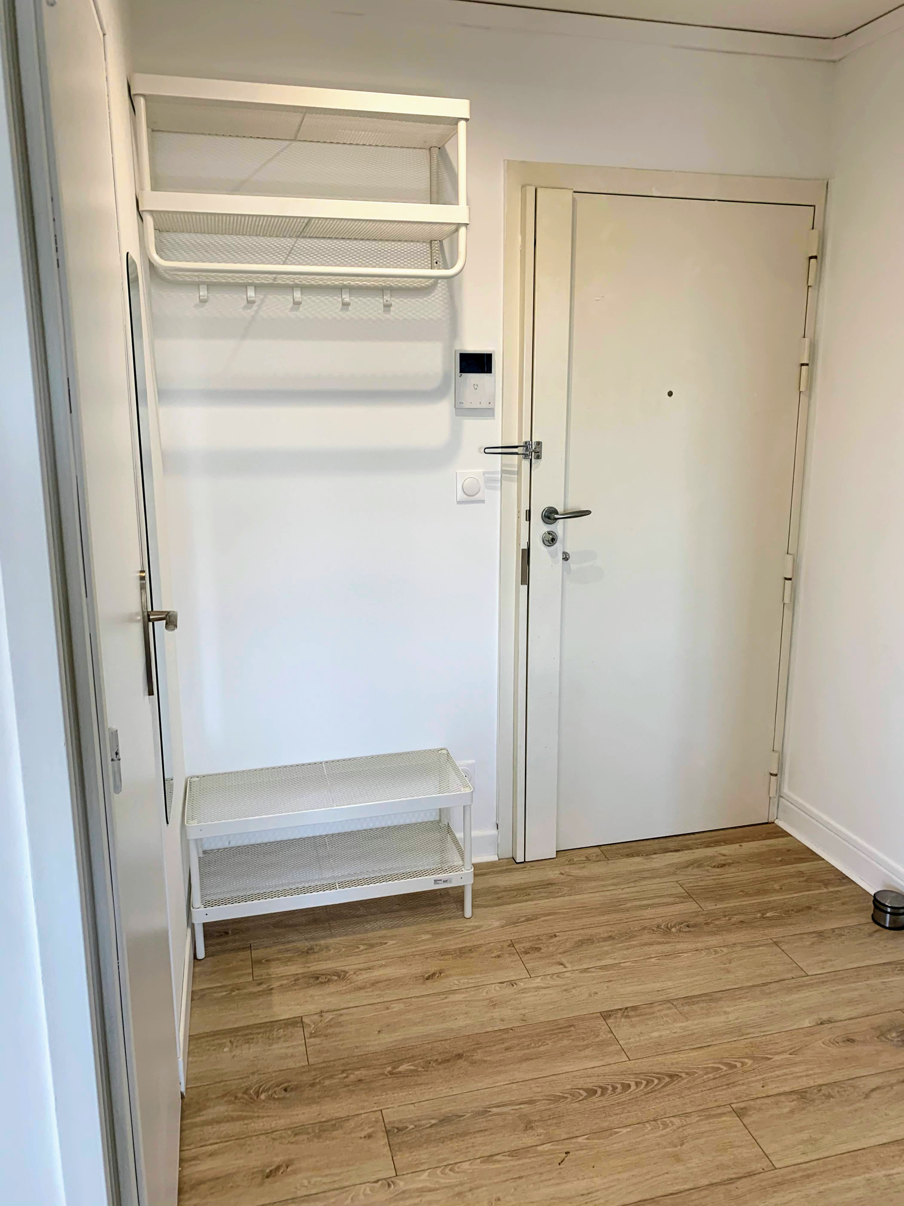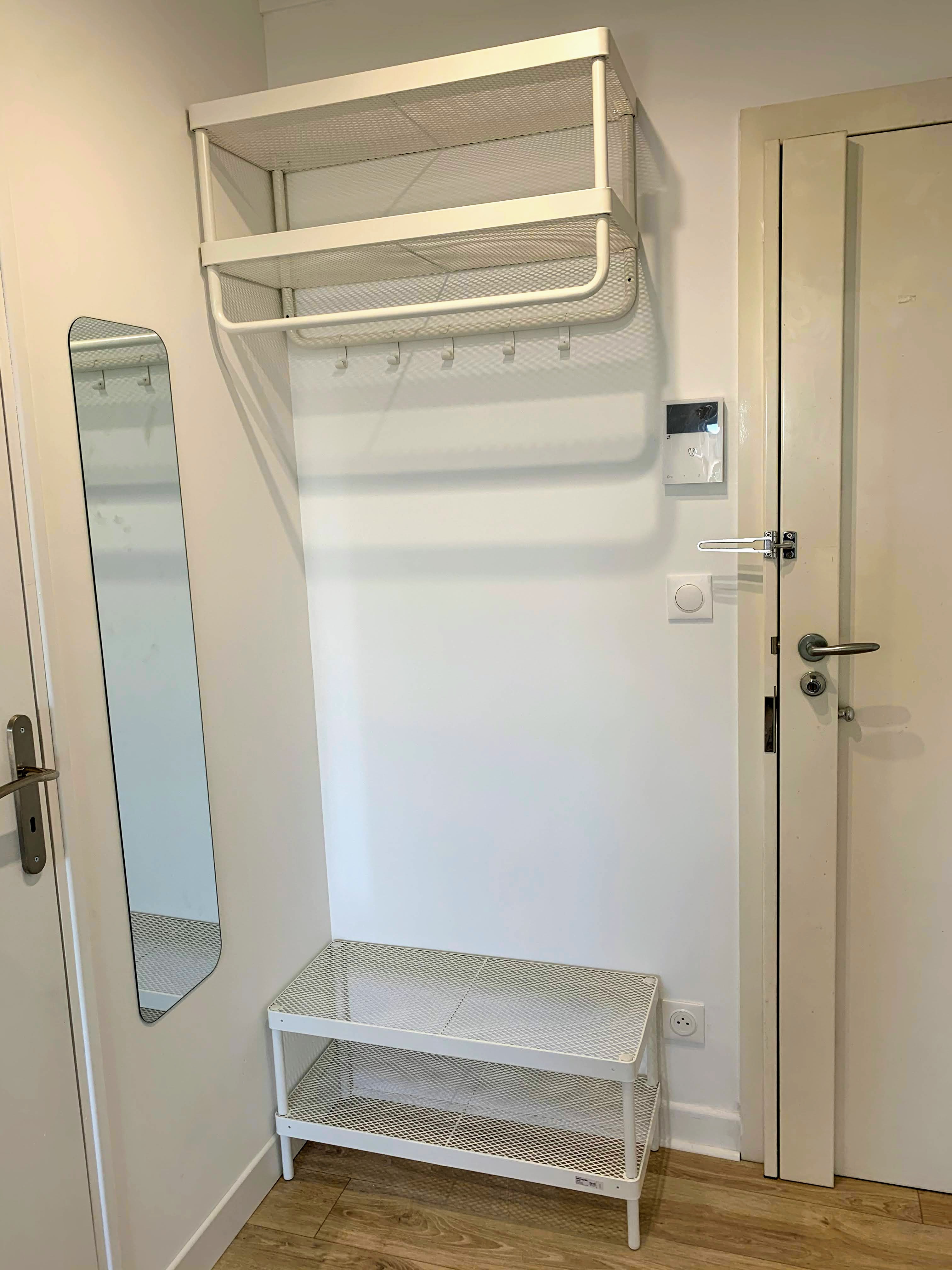 L’entrée comprend une porte blindée 3 points, un interphone vidéo, un porte manteau, un banc et un grand miroir.